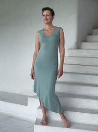This sleeveless midi dress is cut on the bias to gently contour the body with a naturally flattering drape. Crafted from soft stretch rayon jersey, it offers a fluid silhouette that shifts with your shape and feels effortless from morning to night. Designed as a base layer or standalone piece, it pairs just as easily with flip flops and a beach hat as it does with boots and a jacket. The asymmetrical hem adds a modern touch, while the clean scoop neckline keeps styling versatile. Ideal for travel, layering, or everyday wear. Also available in a tunic length.