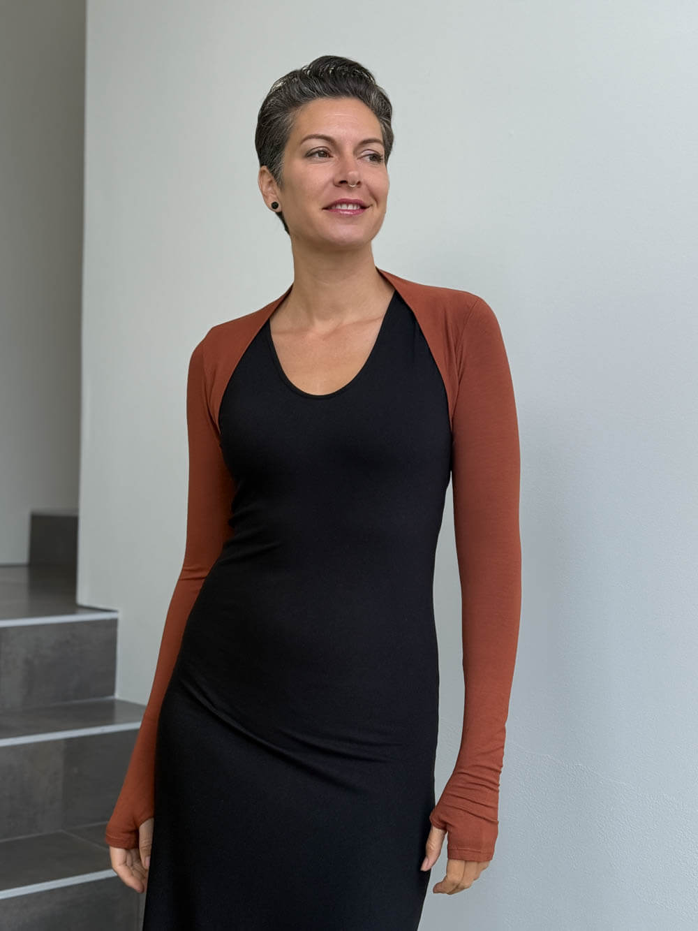 Need just a little something? The Sleeve Shrug is your go-to minimalist layer—designed to add sleeves without the bulk. This cropped, open-front bolero-style piece offers lightweight coverage exactly where you want it: arms and shoulders. Made from ultra-soft rayon jersey with a smooth, second-skin feel, it’s the perfect finishing touch over dresses, tanks, and strappy tops.
