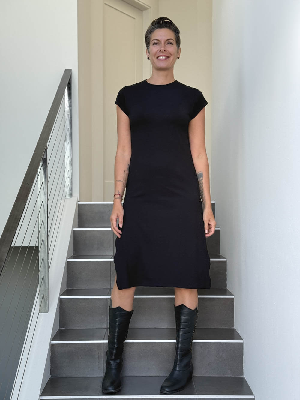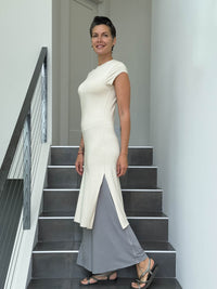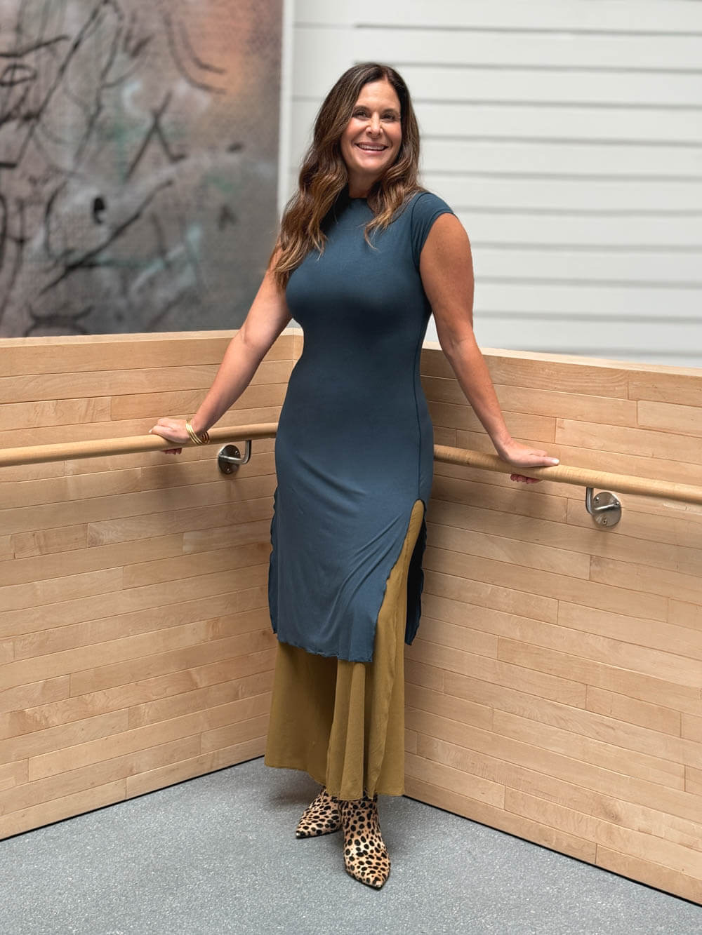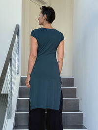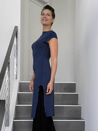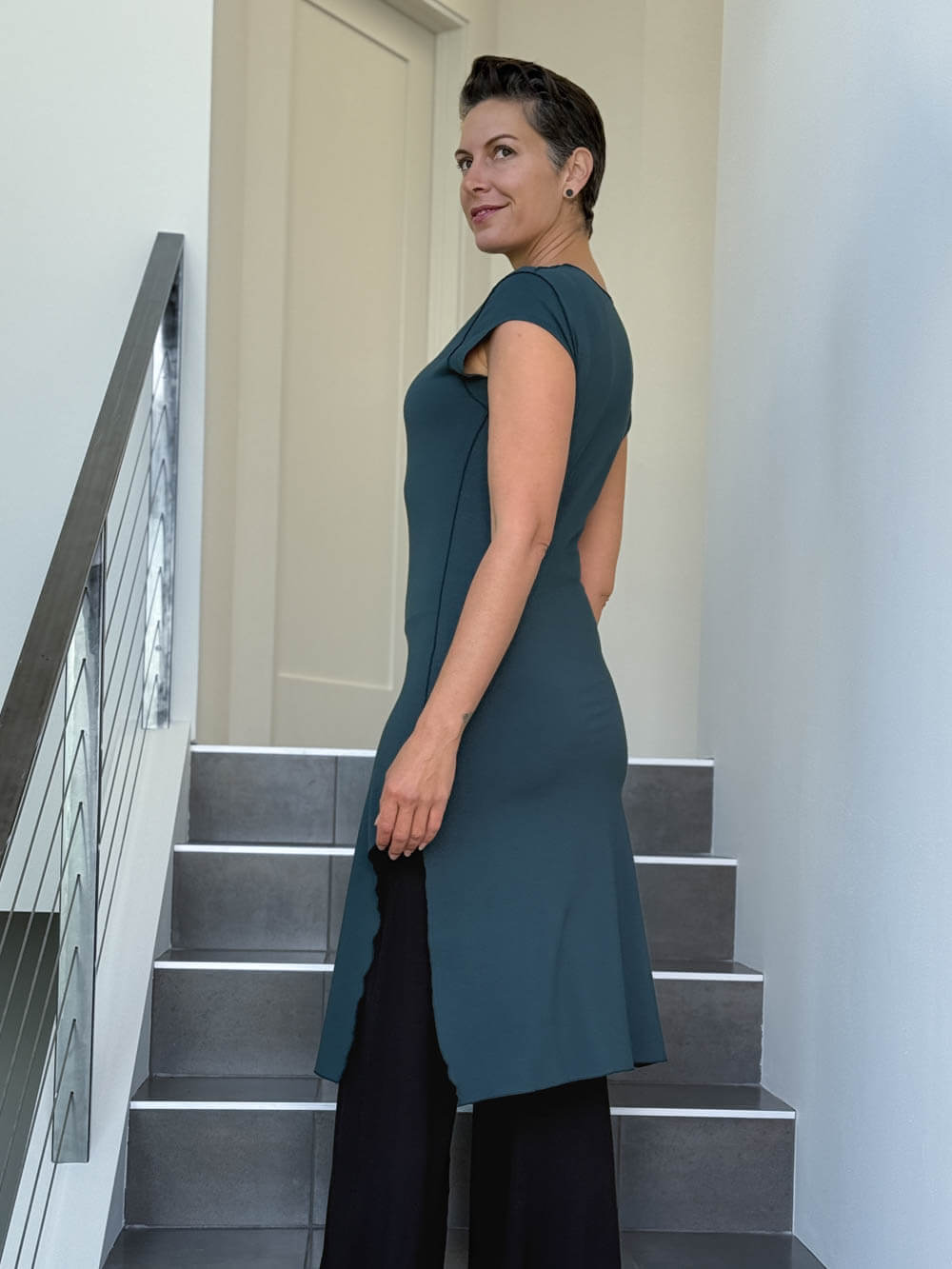 This sleek tunic has two side slits and can be worn as a dress or with pants or leggings. It features a mock neckline, rolled hem edges, and a fitted silhouette.