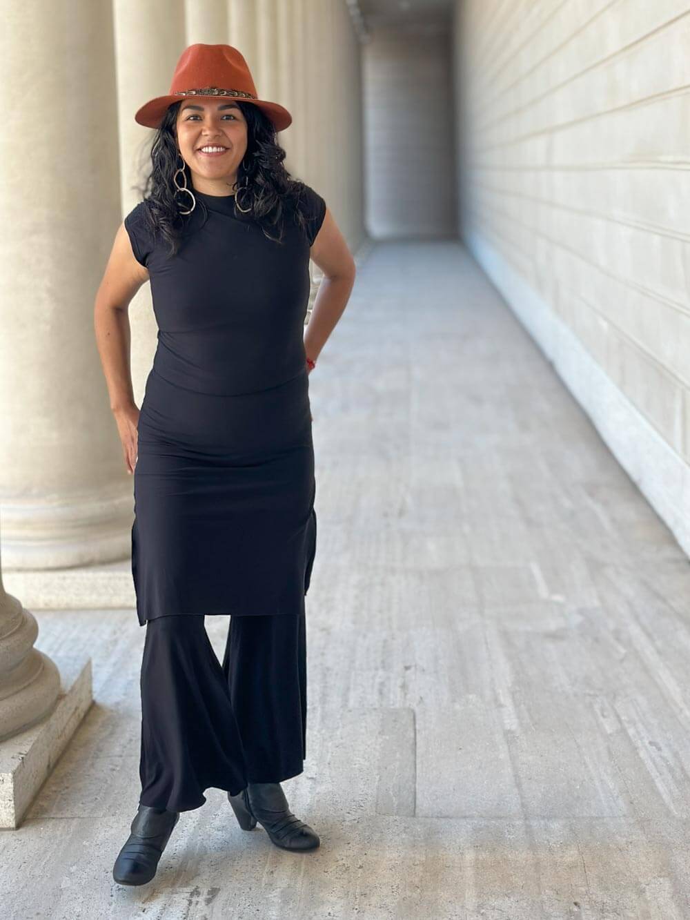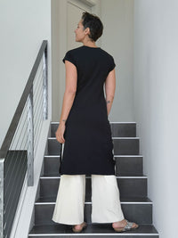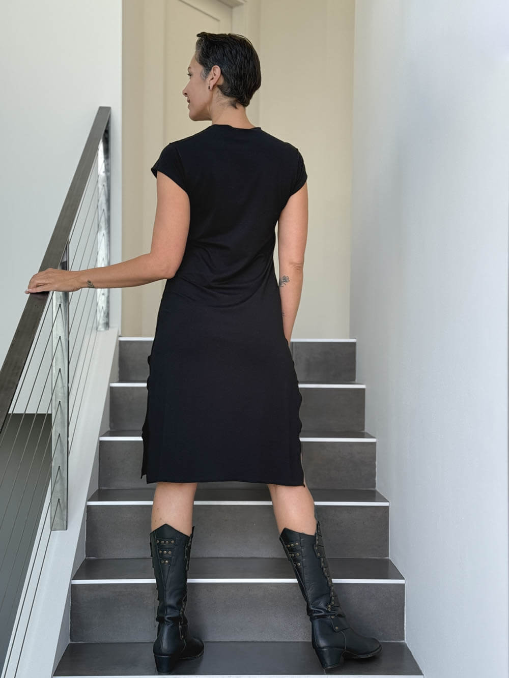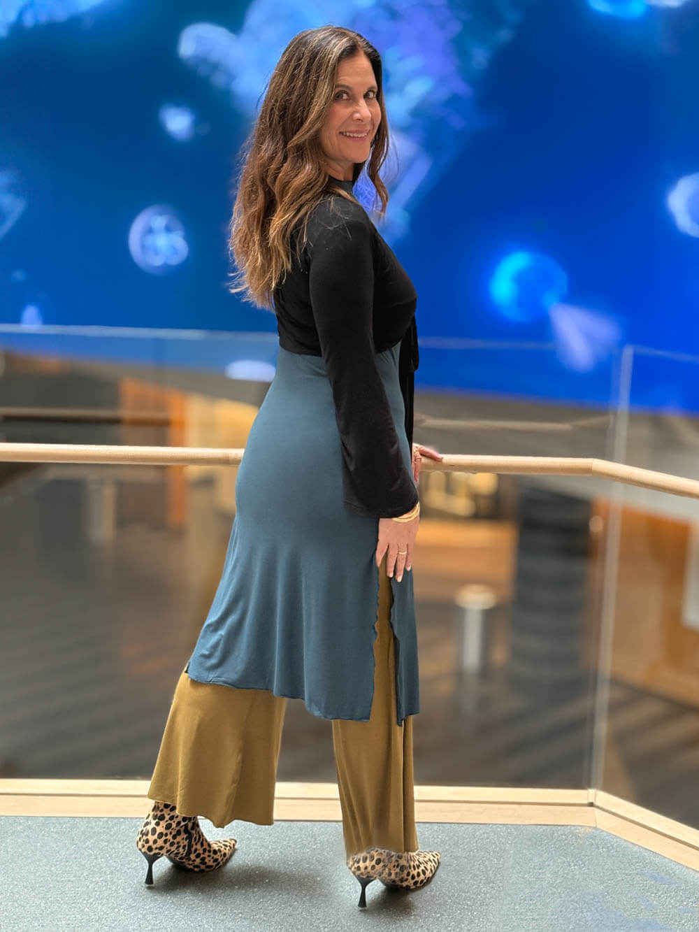 This sleek tunic has two side slits and can be worn as a dress or with pants or leggings. It features a mock neckline, rolled hem edges, and a fitted silhouette.