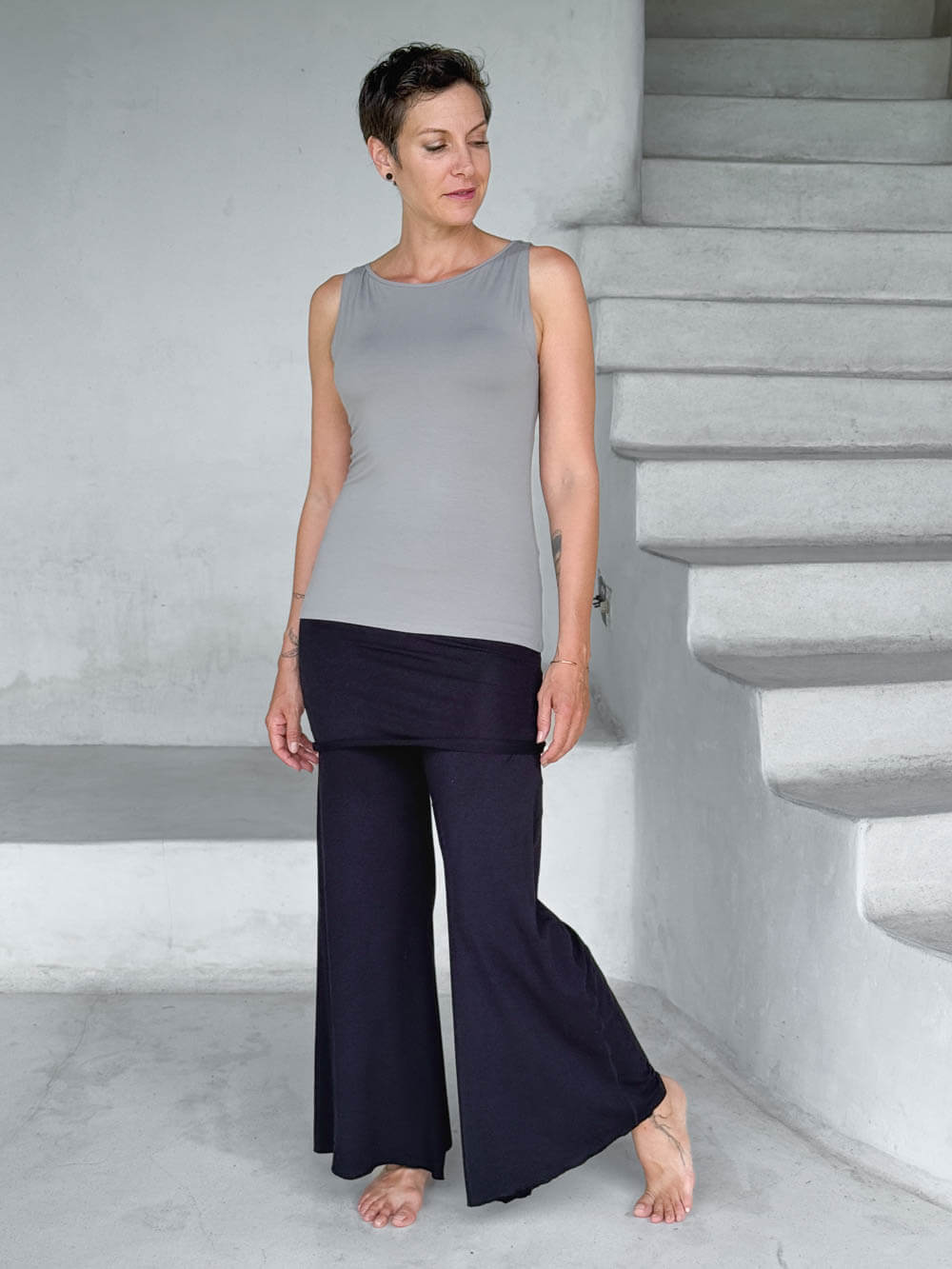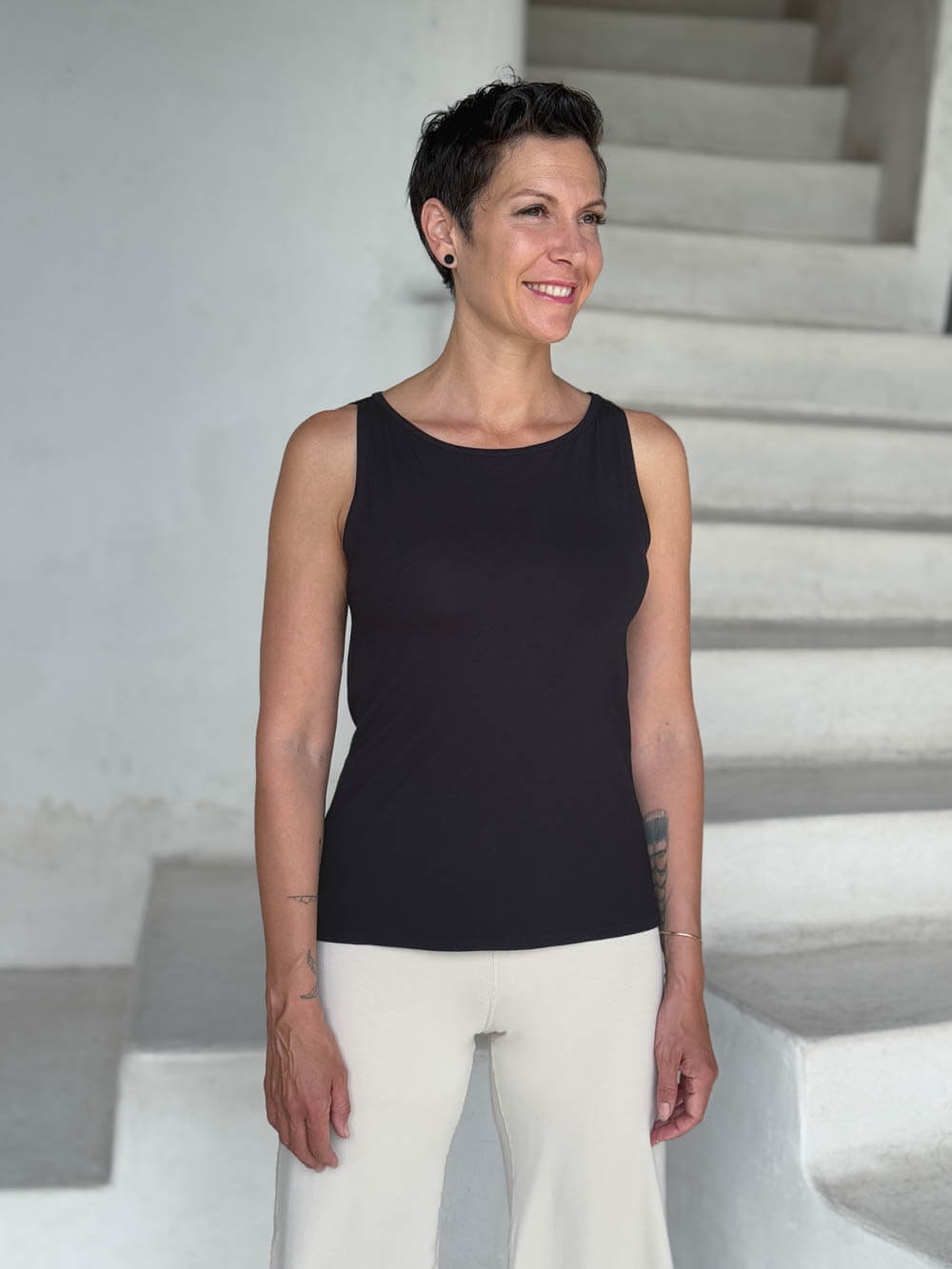 Your new foundation piece. Our classic, yet modern layering tank top  is sleek, streamlined, and made for layering (but strong enough to stand alone). With a high, elegant neckline and a fit that contours comfortably without clinging. It tucks effortlessly into wide-leg pants, skirts, and under anything you throw over it.