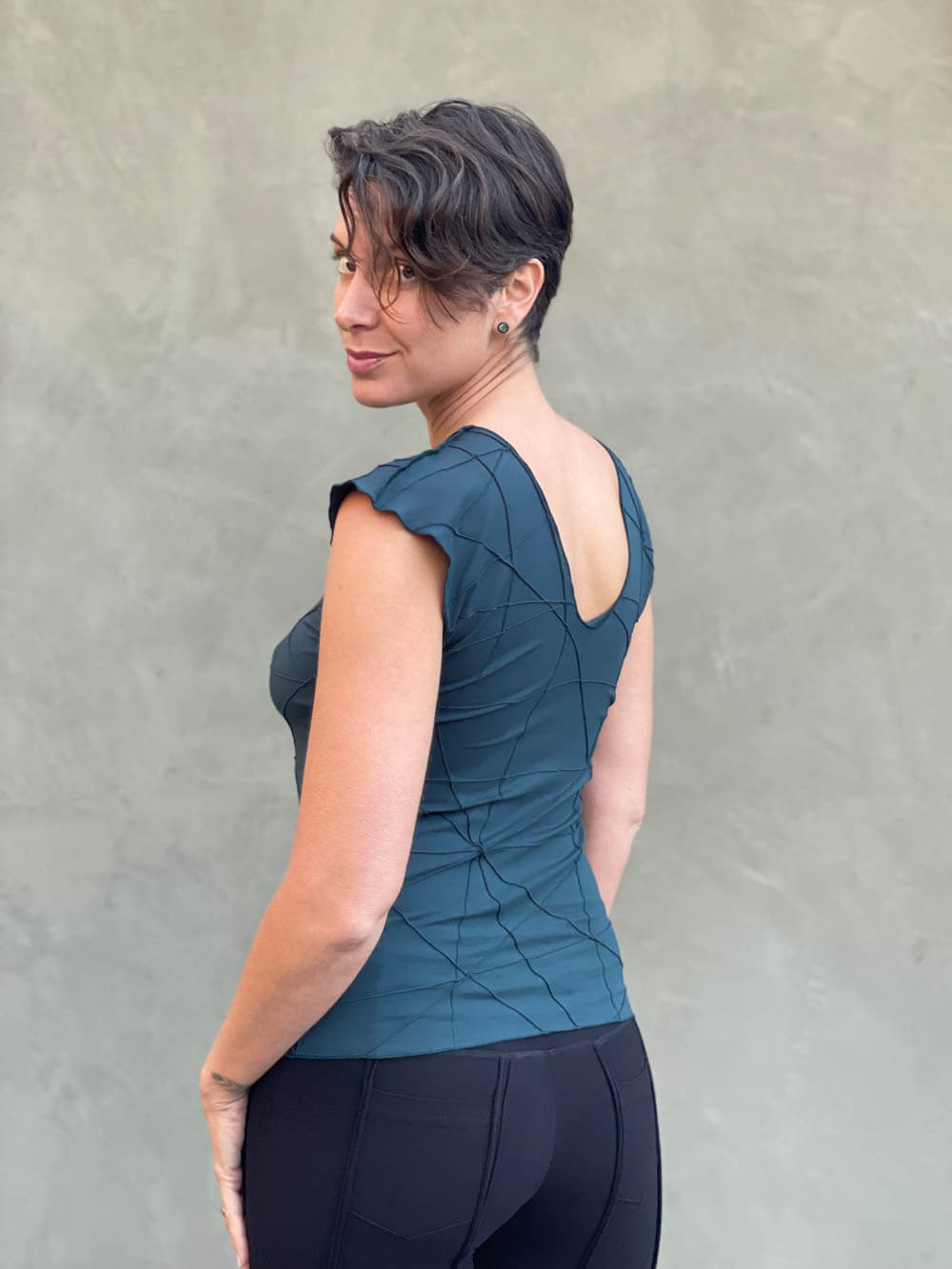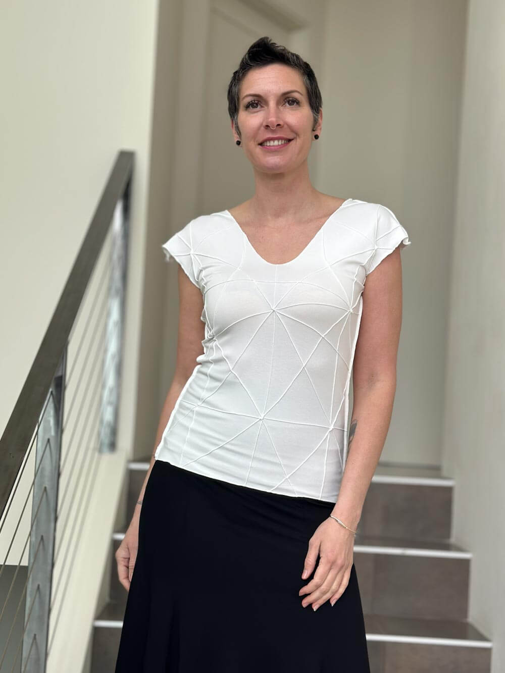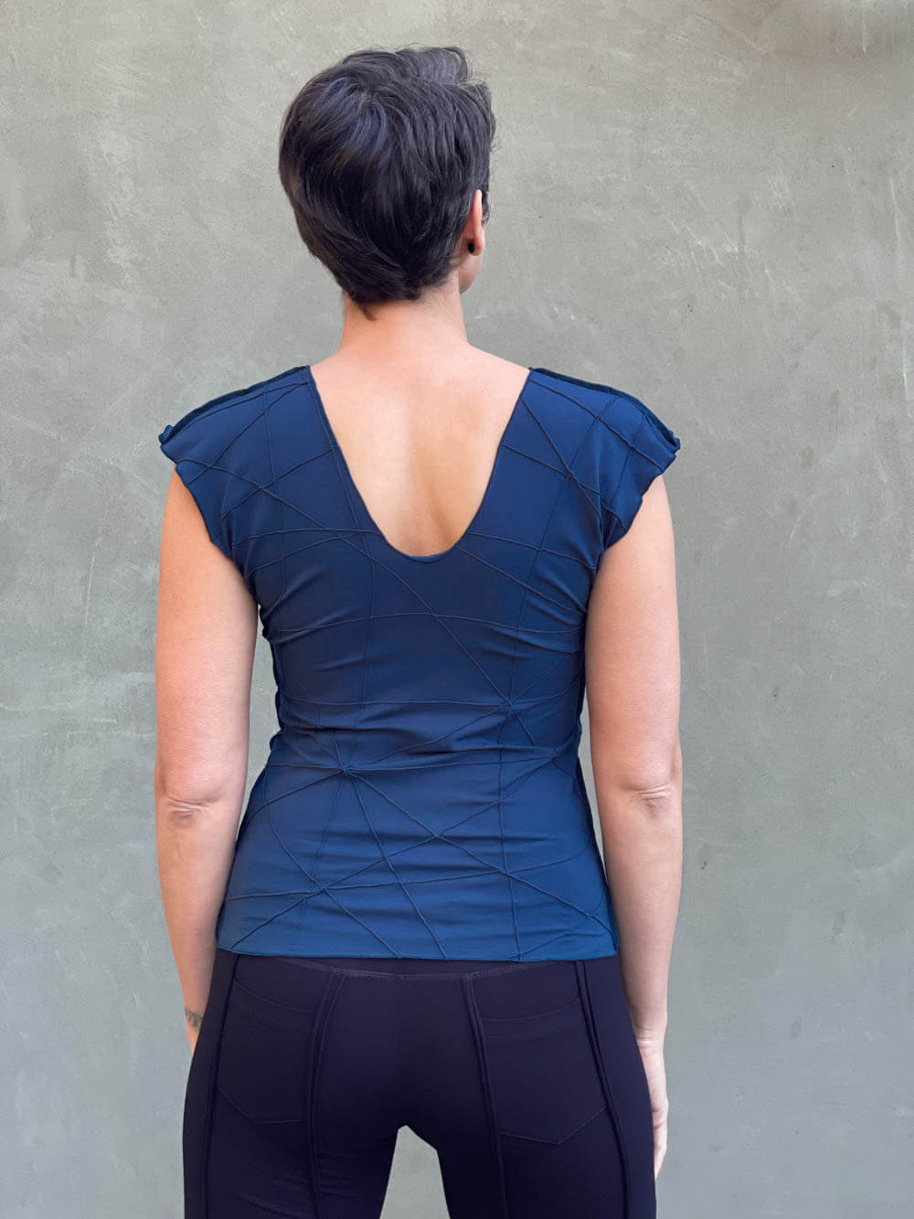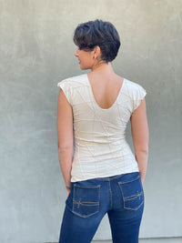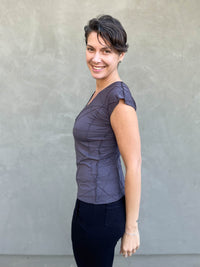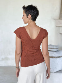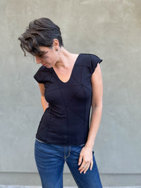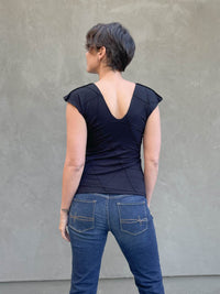 Our summer t-shirt alternative. Made from our textured jersey, this top is stretchy and easy. The scoop neck is mirrored on the back and the length hits just below the waistline.
